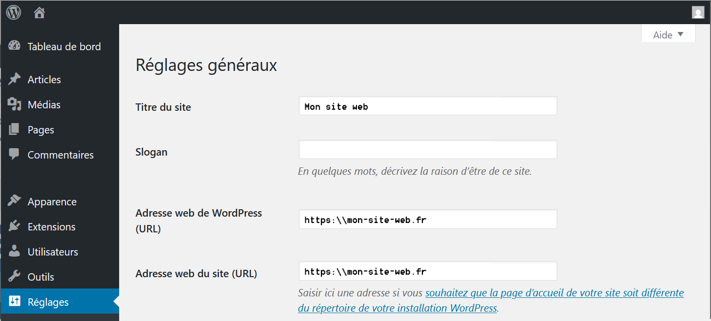 Aller dans la barre latérale de gauche, puis cliquer sur « Réglages » pour vérifier que les adresses web de WordPress et du site ont bien été modifiées en HTTPS.