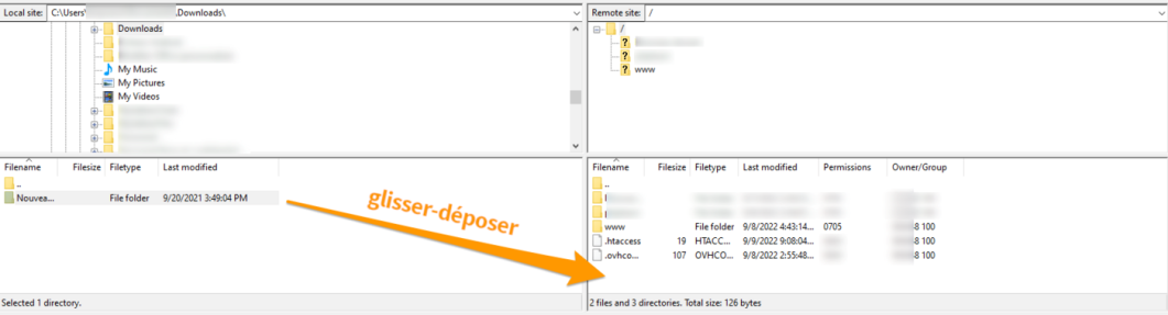 Lorsque la connexion au serveur FTP est établie, il faut réaliser le transfert du fichier « .htaccess » en réalisant un glisser-déposer depuis la fenêtre de gauche (ordinateur) vers la fenêtre de droite (hébergement).