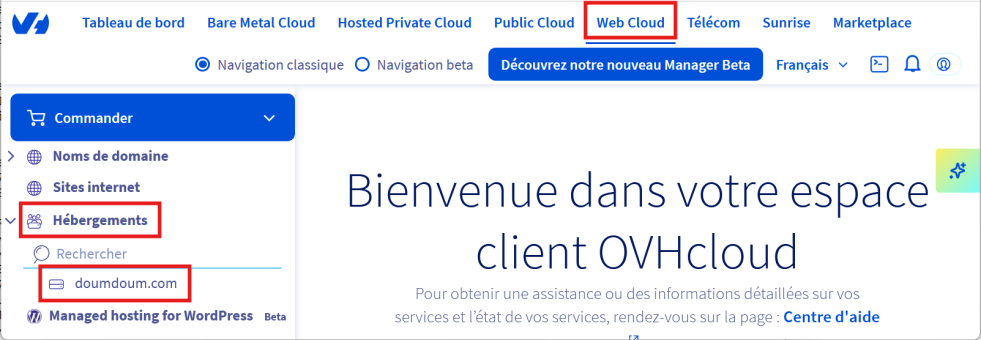 Une fois connecté dans l’hébergement mutualisé OVH, il faut se rendre dans l’onglet « Web Cloud », puis dans la barre latérale de gauche cliquer sur « Hébergements » et ensuite cliquer sur le nom de votre domaine.