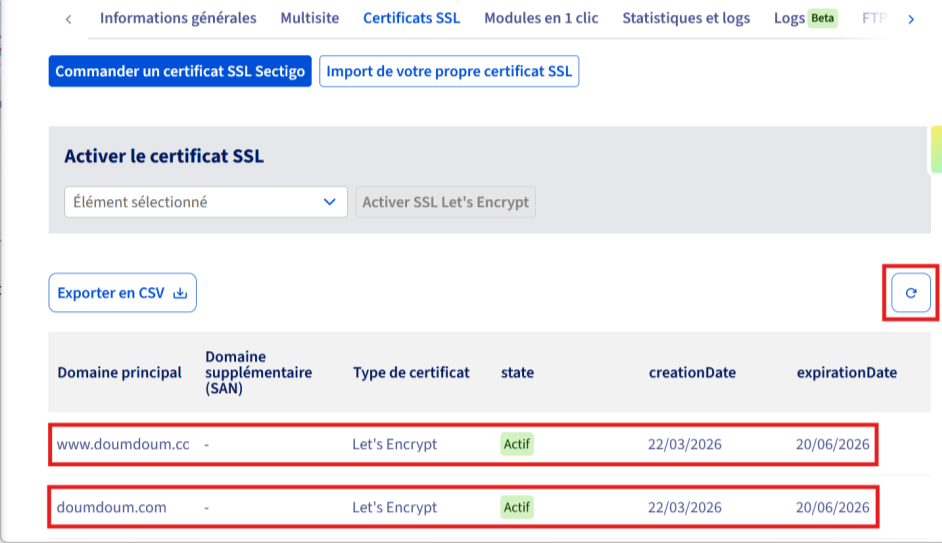 Valider la création des certificats en cliquant sur le bouton « Activer SSL Let’s Encrypt ».