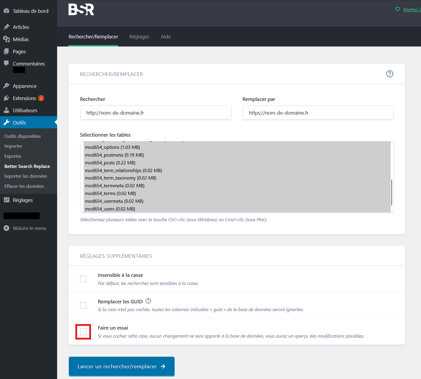 Lorsque le plug-in est activé, dans la barre latérale de gauche, cliquer sur « Outils > Better Search Replace ».