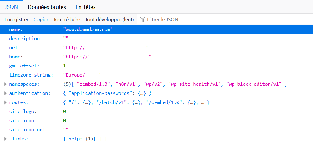 Vous devriez voir une page avec du contenu JSON décrivant les points de terminaison (endpoints) disponibles sur ce site.