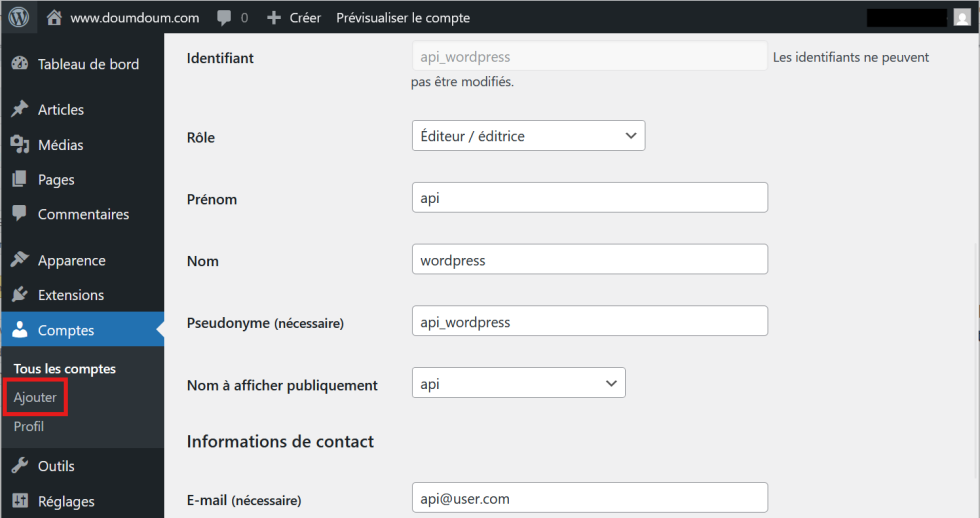 Puis créer un compte utilisateur qui dispose des autorisations nécessaires pour les actions que l’API doit effectuer.Par exemple : Un rôle d’éditeur pour créer des articles ou d’administrateur pour des actions plus larges.