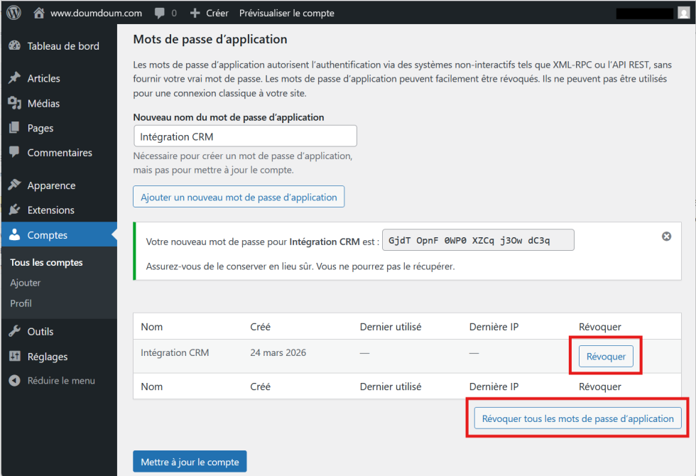 Dans le cadre de la gestion de l’API REST, il est possible de révoquer (supprimer) les mots de passe d’application, si vous ne les utilisez plus ou si vous suspectez une compromission de sécurité.